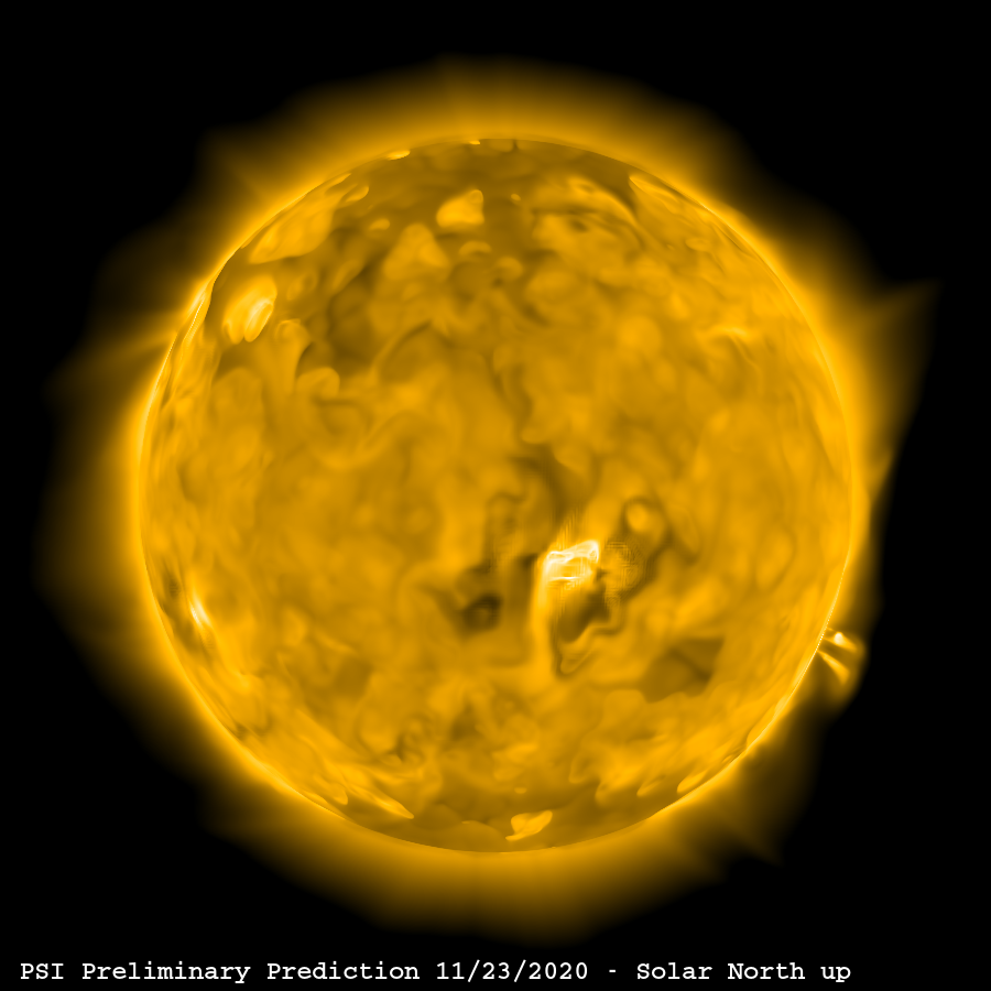 The images above show the predicted coronal emission during the eclipse. The four channels shown represent measurements taken by the Solar Dynamics Observatory (SDO) and the Hinode Spacecraft, both of which continuously observe the Sun from space.